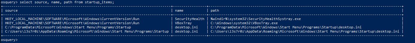 We can also use osquery to detect the registry change by querying the “registry” osquery table. We can also query the “startup_items”, which shows all the start-up paths to executables that are executed at system start-up. The command used is shown below: