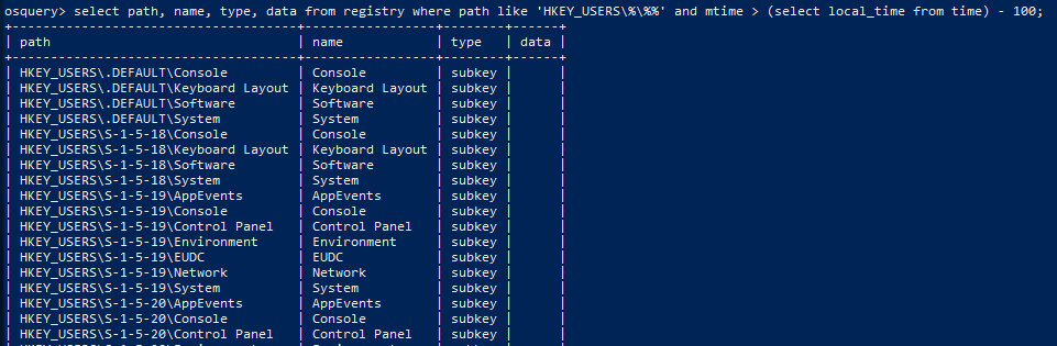 select path, name, type, data from registry where path like 'HKEY_USERS%%%' and mtime > (select local_time from time) - 100;