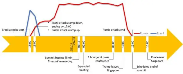 "From June 11 to June 12, 2018, F5 Labs, in concert with our data partner, Loryka, found that cyber-attacks targeting Singapore skyrocketed, 88% of which originated from Russia. What's more, 97% of all attacks coming from Russia during this time period targeted Singapore." reads the analysis published by F5 Labs. "We cannot prove they were nation-state sponsored attacks, however the attacks coincide with the day President Donald Trump met with North Korean President Kim Jong-un in a Singapore hotel."