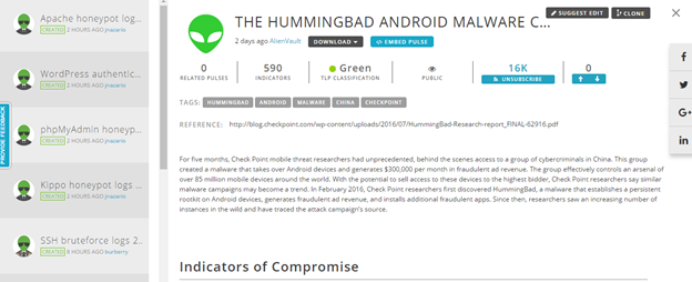 OTX - Open Threat Exchange: AlienVault Open Threat Exchange (OTX) provides open access to a global community of threat researchers and security professionals. It delivers community-generated threat data, enables collaborative research, and automates the process of updating your security infrastructure with threat data from any source.