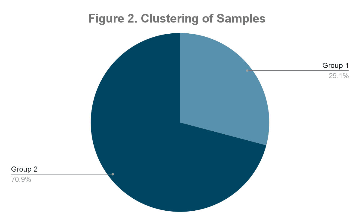 From a total of 500,000 analyzed samples by Palo Alto, two clusters were created, representing different payloads dropping a final web shell. As observed in Figure 1, payload 2 (highlighted as Group 2) is more significant than payload 1, presenting 70% of the collected samples.