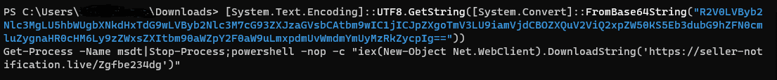 After decoding the Base64 payload, the plain text indicates a new payload is downloaded from the internet and executed.