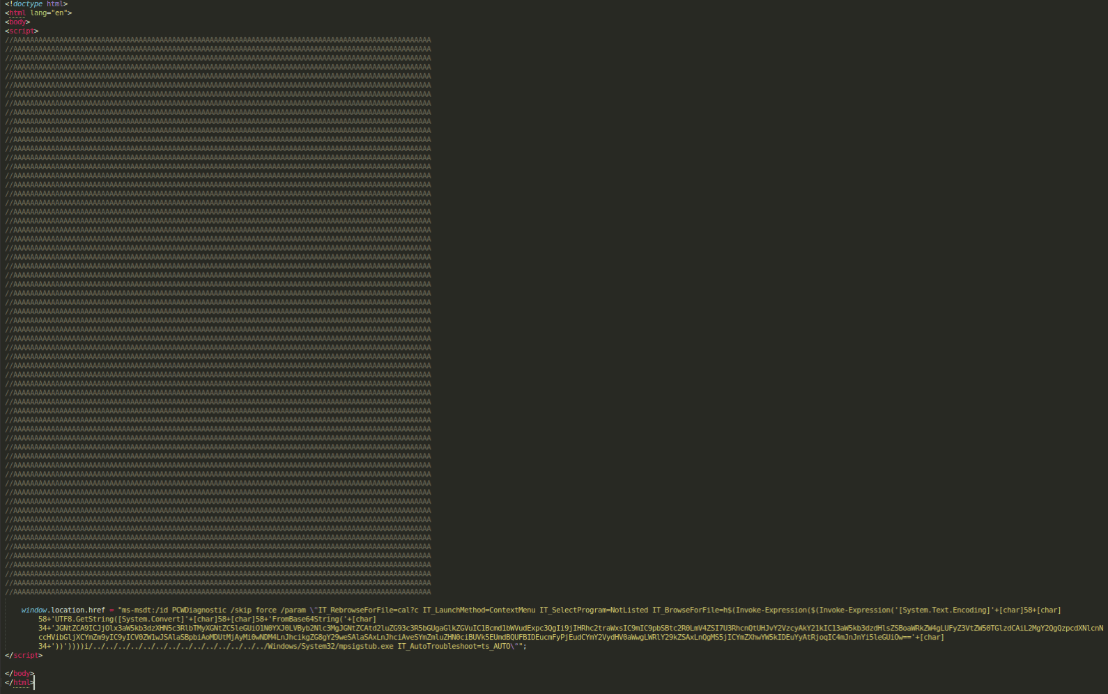 Digging into the resource details, the ms-msdt Powershell script is loaded remotely and executed. As observed below, part of the content is encoded via Base64.