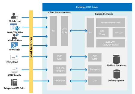 As noted by Keysight and others, Microsoft Exchange servers have a specific block architecture designed to handle high loads and provide availability and communication between different server versions. For example, multiple exchange servers running the same version could be configured to work using a database availability group (DAG) to provide database-level recovery from failures.