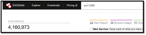 The filter above returns all of the hits discovered by Shodan as having the default RDP port 3389 open. As we can see below, there are a total of 4,160,973 results.