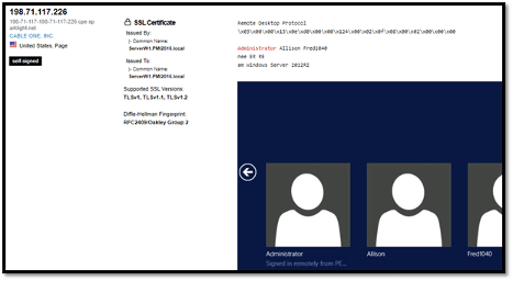 This simply tells Shodan to ignore everything on port 3389, which is the default RDP port, ignore any screenshots, but then look for the text string “Remote Desktop Protocol”. This results in results similar to the following: