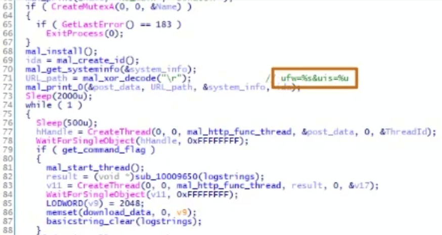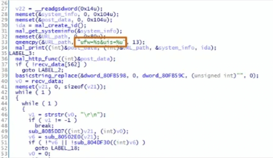 The first packet sent to the C2 server has two PHP parameters, uid and upw. The first one contains a hash value of the target hostname, kernel release number, and IP address. The upw contains a Base64-encoded string of "[IP address]|30.0|12b"
