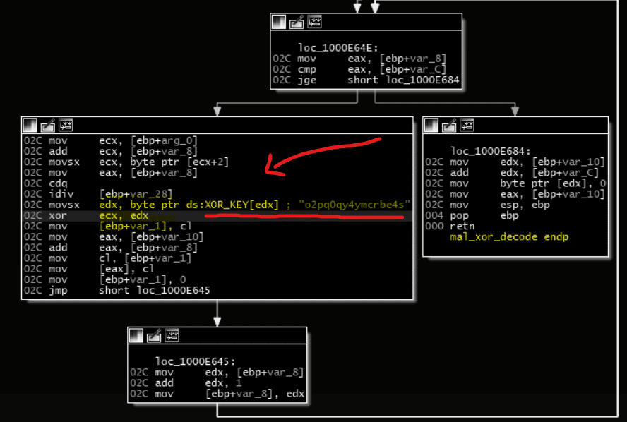This malware uses a simple XOR to obfuscate its strings with a fixed key. In Figure 2 below, we see the key “o2pq0qy4ymcrbe4s” is used to deobfuscate the malware string in runtime.
