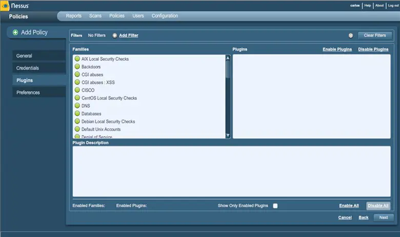 Let's see how Nessus software looks like. The Nessus home version needs to be registered with an email to obtain a onetime activation code. Once activated the software is ready for use. The software has an inbuilt plug-in directory, from which we could install the required plug-in according to our requirement. The software screenshot is given below for reference:
